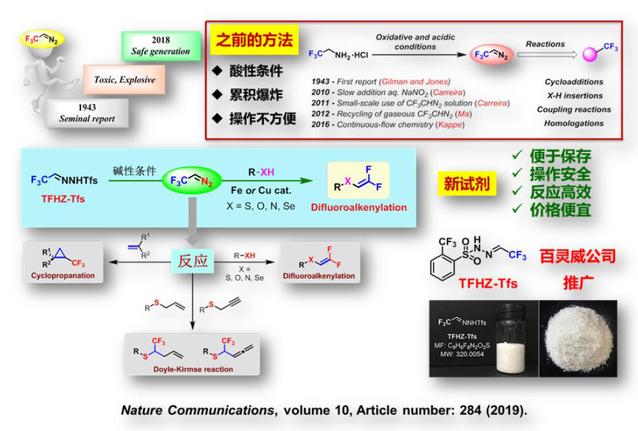 近日,我校化学学院毕锡和教授课题组的研究成果“Use of trifluoroacetaldehyde N-tfsylhydrazone as a trifluorodiazoethane surrogate and its synthetic applications”(“三氟乙醛N-邻三氟甲基苯磺酰腙作为三氟...