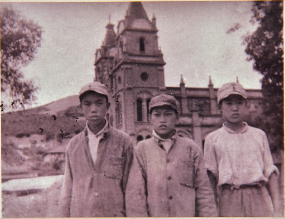 1945年,白皋(中)与战友在延安鲁艺门前合影